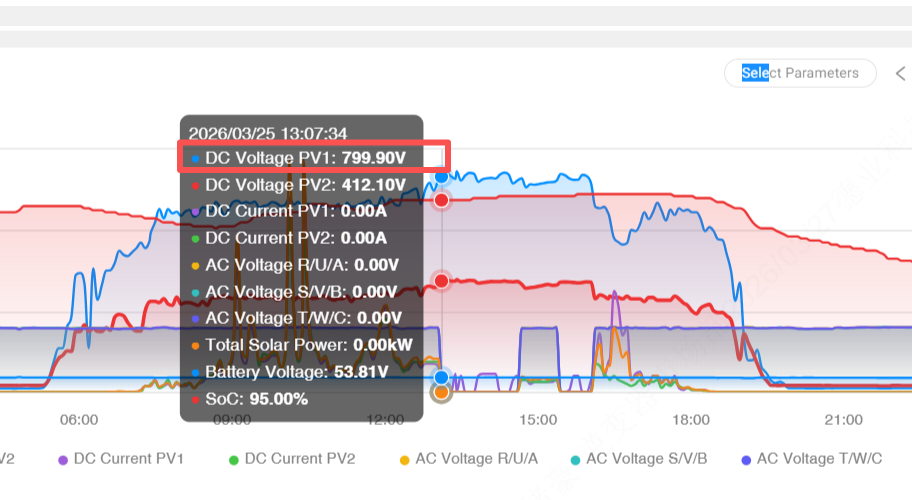 このスクリーンショットは root への鍵です - 原因の特定。コアの異常は明らかです。PV1 の DC 電圧は 799.90 V にスパイクし、PV1 と PV2 の PV 電流は 0.00 A、バッテリー SOC は 95% でバッテリー電圧は 53.81 V、AC 側電圧はすべて 0 V で、インバーターが系統から切り離されていることを示しています。